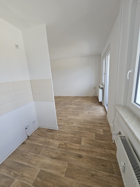 Kleine Einraumwohnung für Singles! Im 1. OG befindet sich eine kleine, helle 1-Raum-Wohnung mit innenliegendem Wannenbad und kleiner Küche. Die Wände und Decken sind in Raufaser weiß gehalten und die Böden mit pflegeleichtem PVC-Belag versehen.