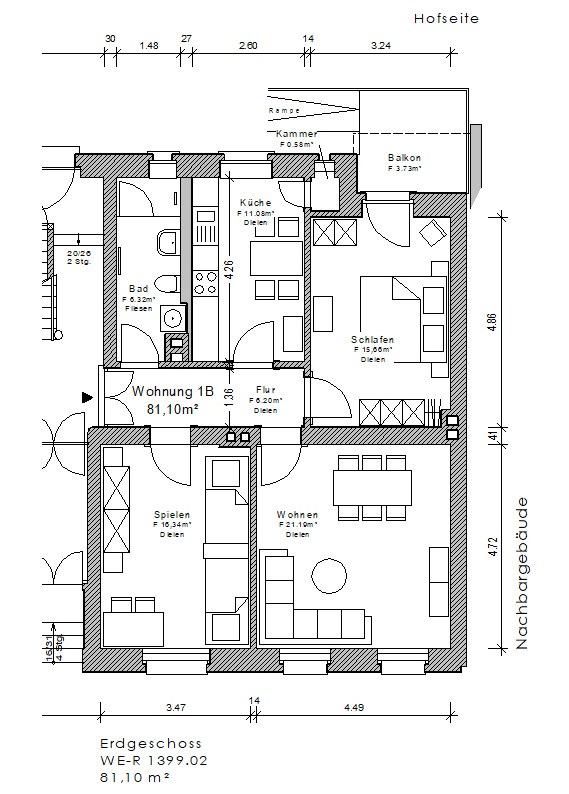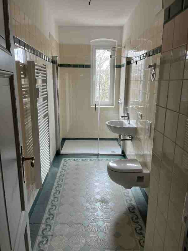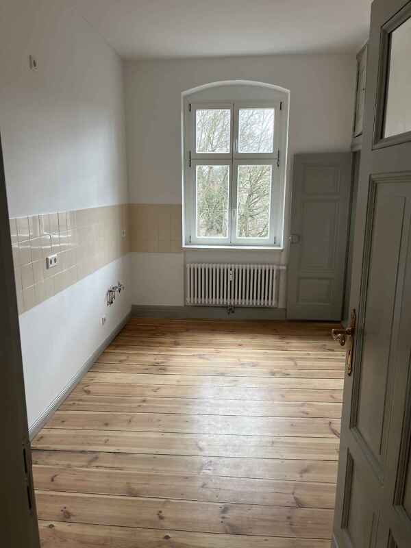 Bei dieser 3-Zimmerwohnung handelt es sich um einen Erstbezug nach Sanierung. Sie befindet sich im Erdgeschoss und verfügt über ein Fenster im hellgefliesten Bad mit Dusche sowie eine Fußbodenheizung. In den Räumen der gut geschnittenen Wohnung sind die Wände glatt gespachtelt, mit Vlies tapeziert und weiß gestrichen. Als Bodenbelag sind aufgearbeitete Holzdielen vorhanden. In der Küche befindet sich eine kleine Kammer, die man als Stau- und Lagerraum nutzen kann. Die Wohnung verfügt über einen Balkon, einen Keller und einen hofseitigen Sonnenschutz.